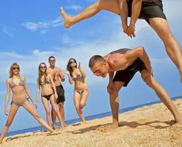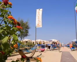 A spacious beach of soft white umbrellas and sun beds next-generation, surrounded by palm trees and flowers, with all the facilities devoted to sports and entertainment.